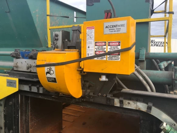 Diese Mosely Two Ram Horizontal Ballenpresse wurde 1995 hergestellt. Sie wurde vor kurzem zusammen mit dem Förderer herausgezogen, ist ein kettengetriebener Gummibandförderer, 72 "Breitband, untere horizontale 65 Fuß 3-15/16", 35 Grad Neigung. 25 Fuß 4 9/17" Steigung, mit einer 15-PS-Antriebseinheit, die alle für 480 Volt verkabelt ist, Drei-(3)-Phasen-Motor. Das Förderband ist in einem großartigen Zustand und lief ohne Probleme Beide Einheiten sind in hervorragendem Zustand und waren 100% betriebsbereit bis zum Austausch durch brandneue Geräte. Zu Beginn des Jahres erhielt dieses Gerät ein Update für 20.000 US-Dollar für die elektrischen Schaltpläne für die neue SPS, die Anfang des Jahres 2019 in die Ballenpresse eingebaut wurde. Abmessungen: Ballenkammer: 29" Hoch x 60" breit x 40" tief
